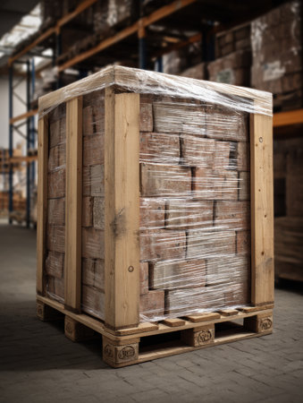 Wooden pallet is stacked with wrapped bricks in a warehouse, open at the top, highlighting storage methods and organization in the industrial environment.