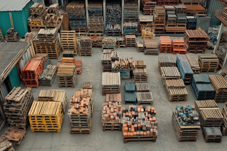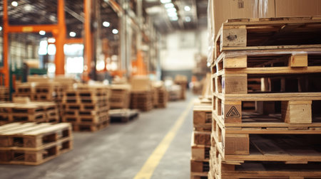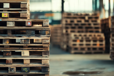 Wooden pallets stacked in distribution warehouse symbolizing logistics and storage