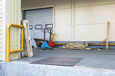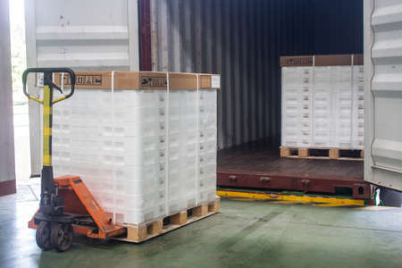 Hand pallet truck loading shipping boxes and goods on wooden pallet at loading dock from container.(Soft focus)