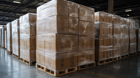 Packaging boxes wrapped in plastic, stacked neatly on pallets in a large storage warehouse. Ideal for showcasing inventory management and supply chain distribution.