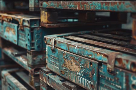 Metal crates piled in a warehouse, under harsh lighting, emphasizing texture and labels
