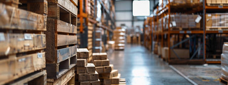 An industrial warehouse with rows of wooden pallets and boxes, showing an organized storage system. The spacious interior is well-lit, creating an efficient working environment.