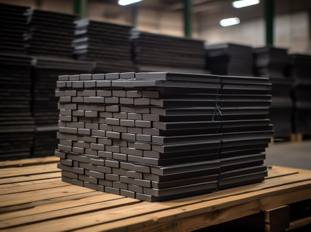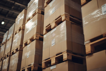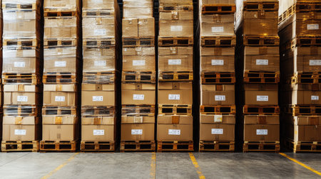 A well-organized warehouse scene featuring stacked cardboard boxes on wooden pallets. This image represents efficient inventory management and logistics operations.