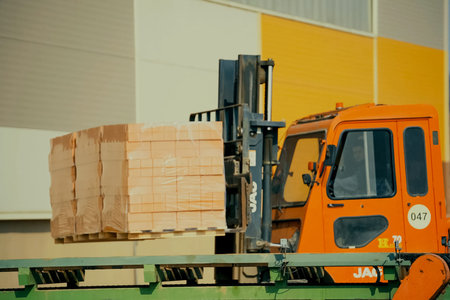 Worker driving forklift loading shipment carton boxes goods on wooden pallet at loading dock from container truck to warehouse cargo storage in freight logistics, transportation industrial, delivery