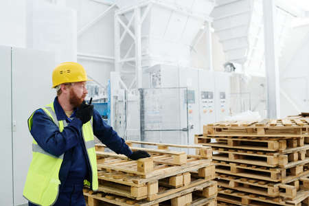 Young confident male engineer in gloves, workwear and safety helmet speaking by walkie-talkie while standing by stack of wooden pallets