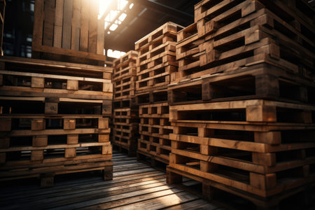 Wooden pallets stacked in a warehouse on blurred background. Generative AI illustration