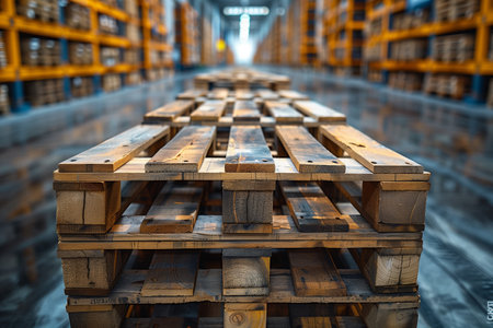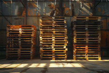 A stack of wooden pallets in an industrial warehouse, ready for transport and storage