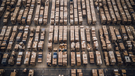 Automated warehouse displays abundant stock of geometrically arranged pallets, generative AI
