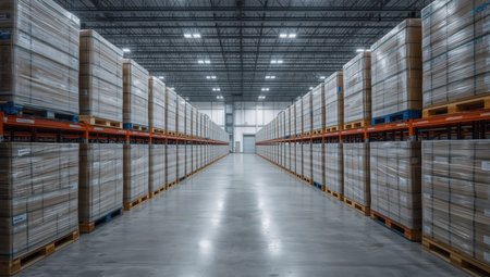 Within a vast warehouse, colorful pallets filled with various products are neatly arranged along the aisles. The bright overhead lights illuminate the organized chaos of industrial efficiency.