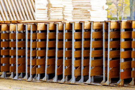 Stacks of wooden pallets in warehouse outdoor storage for industrial transportation.