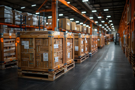 pallets stacked with boxes wrapped in plastic, created with generative ai
