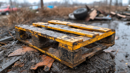 A yellow painted wooden pallet sits on a pile of mud and debris in a rainy outdoor setting, suggesting industrial decay and environmental neglect.