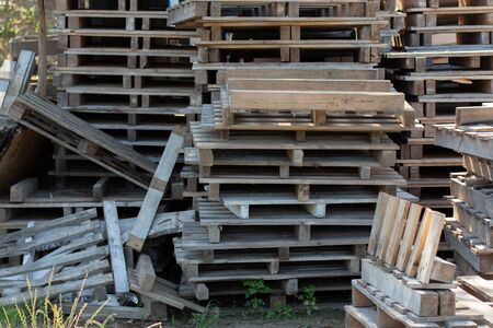 A stack of old wooden pallets for loading. Logistics and cargo delivery.
