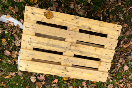 A wooden pallet made of light pine rests on a carpet of colorful autumn leaves in a park. The scene captures the essence of fall with vibrant yellows, oranges, and browns surrounding the pallet.