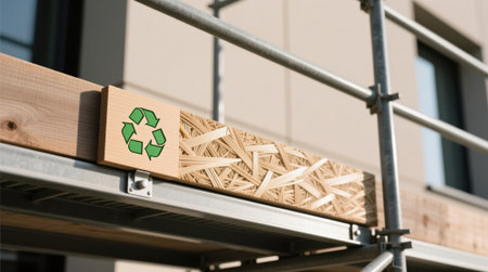 Engineered wood scaffolding plank with green recycle symbol on metal construction frame.