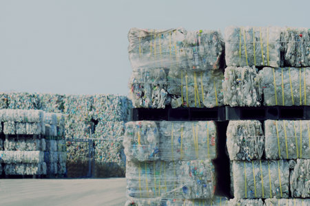 A recycling plant with stacks of compressed aluminum cans, ready for repurposing.