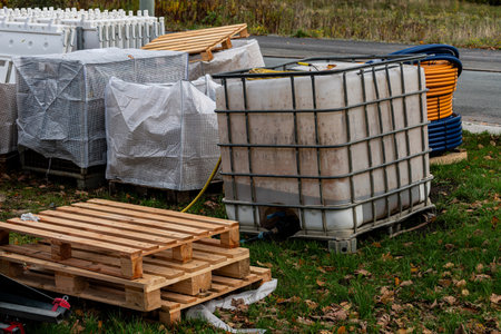 Containers and pallets are arranged at a construction site near a road. The area is surrounded by grass and trees. The scene shows preparations for work with various materials present.