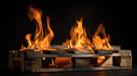 Captivating flames rise from a wooden pallet, illuminating the dark surroundings with a warm glow. Perfect for evoking fire's essence.