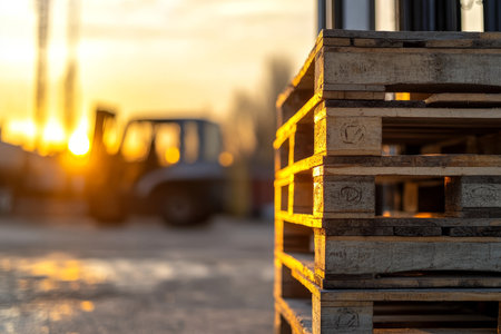 Stacked wooden pallets are illuminated by the warm glow of sunset in a storage yard. The sunlight casts a soft light on the pallets, creating a serene atmosphere.