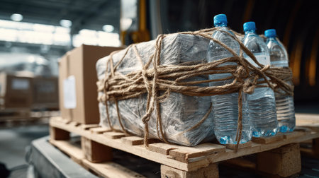 A wooden pallet supports a bundle of water bottles, wrapped in plastic and tied with rope, showcasing an organized storage solution within an industrial warehouse setting.