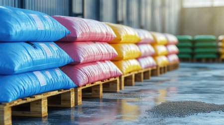 A vibrant arrangement of colorful bags of fertilizer neatly stacked on wooden pallets inside a warehouse, showcasing the agricultural industry's storage solutions.