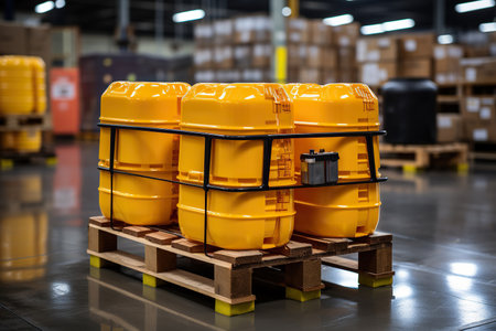 Yellow barrel drum on the pallets contain liquid chemical in warehouse