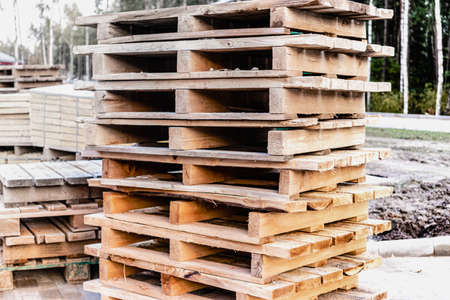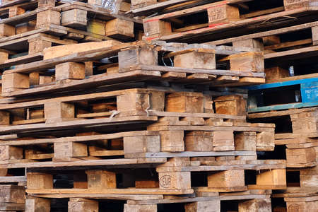 Many Old Used Wooden pallets is stack outdoors in the warehouse of cargo delivery enterprise.