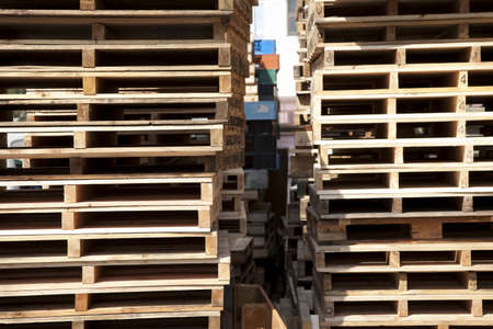 Wooden pallets on the street in the evening. Industrial background