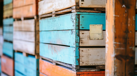 This close-up image showcases colorful wooden shipping crates, perfect for international transport. The vibrant colors and rustic textures highlight a unique and organized storage solution for logistics.