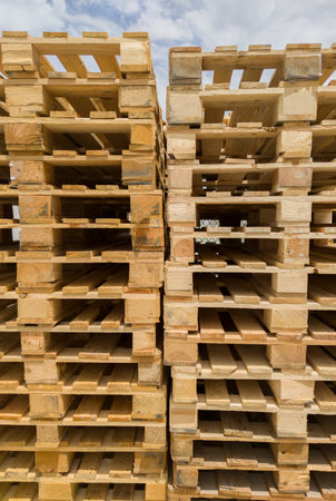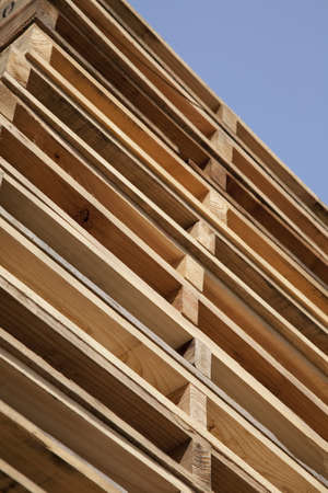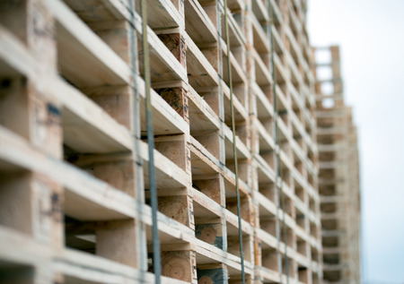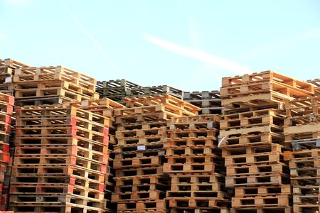 Wooden pallets stacked, building materials stacked against the sky