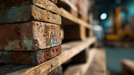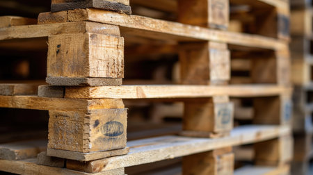 Wooden pallets stacked in a warehouse on blurred background. Generative AI illustration