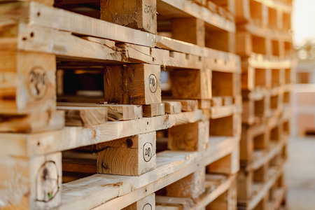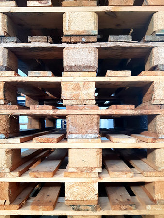 Stack of wooden pallet. Industrial wood pallet at factory warehouse. Cargo and shipping concept. Sustainability of supply chains. Eco-friendly nature and sustainable properties. Renewable wood pallet.