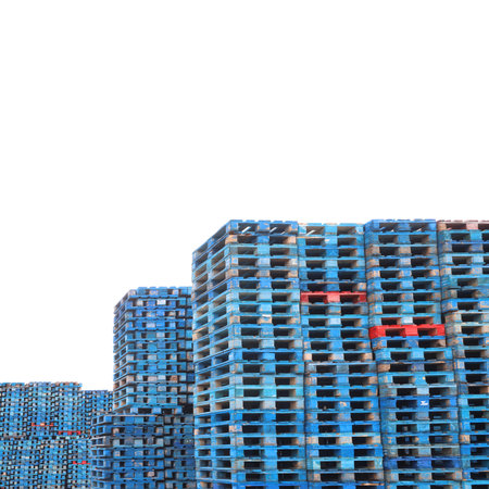 Many colorful blue wooden pallets abstract background stacked stack isolated on white background. Storage and transport equipment pallet concept
