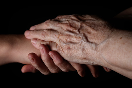 Closeup of a young caucasian man holding the hand of an old caucasian woman