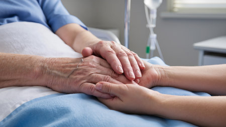 A compassionate nurse holding a patient hand, with a warm and hopeful atmosphere in a hospital room.