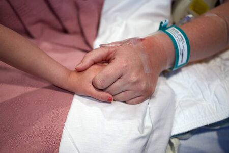 Mother assisting her daughter at the hospital and holding her hand, the girl is sleeping and holding her teddy bear