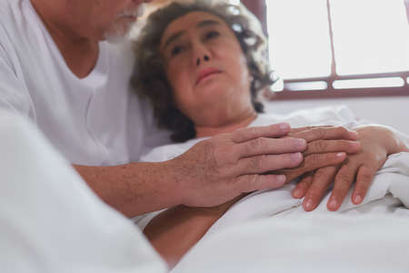 Close up granddaughter takes care of the health sick grandmother at home by holding hands. Lifestyle support the love of the family.