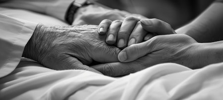 A heartfelt moment captured in black and white, depicting two hands intertwined in a gesture of compassion, symbolizing care and connection in a caregiving environment.