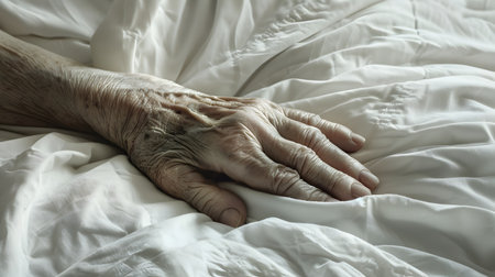 This captivating image showcases the weathered yet resilient hand of an elderly patient resting atop fresh hospital linens The soft natural lighting accentuates the delicate texture of the skin