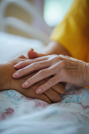 A touching moment of compassion and support as a younger hand holds an elderly one, symbolizing care, love, and connection on a white bed.