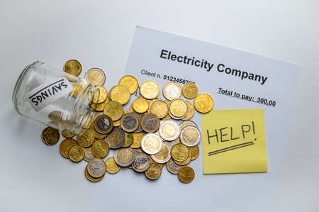 Electricity bill, with coins, jar with savings text and yellow note with help! Text. Increase in electricity prices and tariffs.