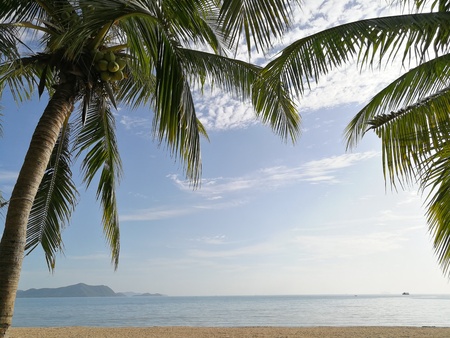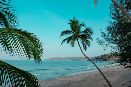 Tropical sand beach with palm leaves. Palm trees against blue sky, Palm trees at tropical coast, coconut tree. summer rest concept. Sunny tropical paradise beach with white sand and palms.