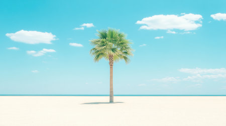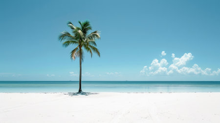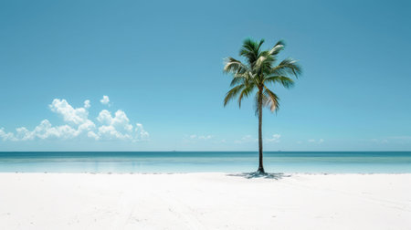 A palm tree stands on the sandy beach near the vast ocean, under a clear blue sky with fluffy clouds, adding to the beautiful coastal natural landscape AIG50