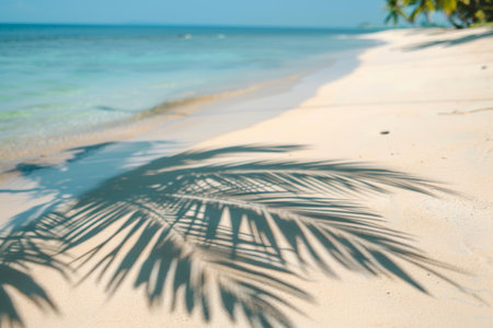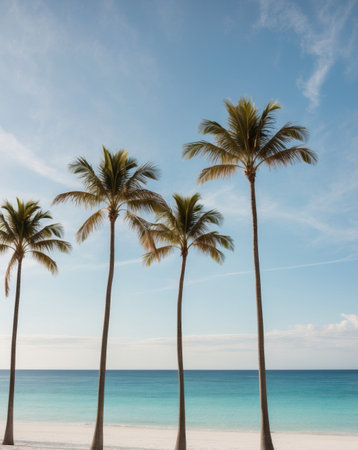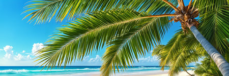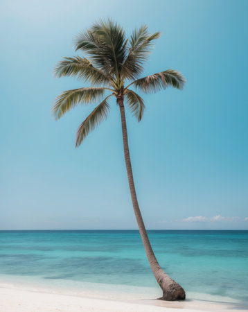 Lush palm tree leaning over pristine white sand beach, with turquoise ocean waves gently lapping the shore, creating a serene tropical paradise for summer vacations