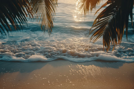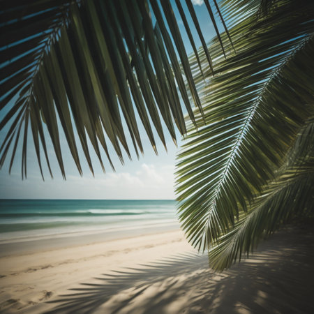 Experience a tranquil escape to a tropical beach where gentle waves meet golden sand, framed by lush palm leaves and bathed in warm sunlight. Perfect for relaxation.