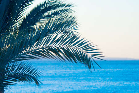 Palm tree on the background of the sea shore in the rays of the setting sun. The concept of rest and vacation in a warm country. Front view.