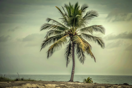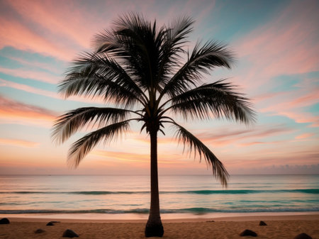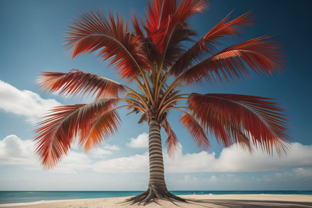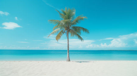 Single palm tree is standing on a beautiful tropical sandy beach with ocean waves in a sunny summer day, creating a perfect idyllic holiday destination