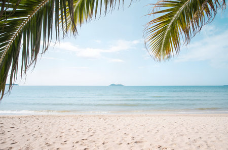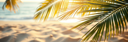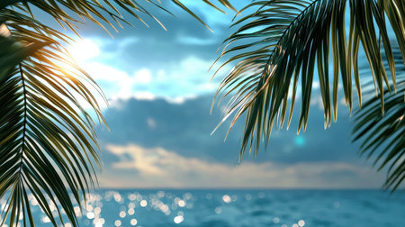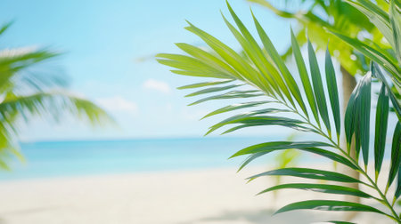 Tropical Beach Scene with Palm Leaves and Ocean Background. Concept of Summer Vacation, Coastal Relaxation, Exotic Getaway, Beach Serenity, Copy space.