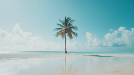 A serene tropical beach features a solitary palm tree surrounded by calm clear water. Gentle waves lap at the shore under a bright blue sky. Fluffy clouds add to the tranquil atmosphere.