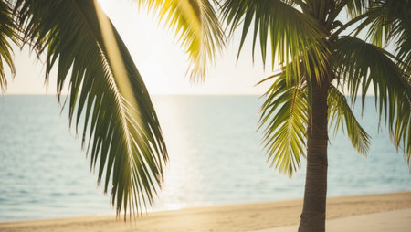 Bright sunlight filtering through palm leaves on a tranquil beach at sunset